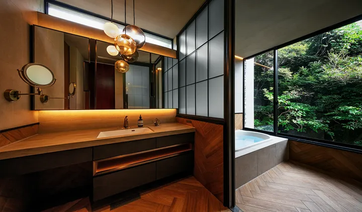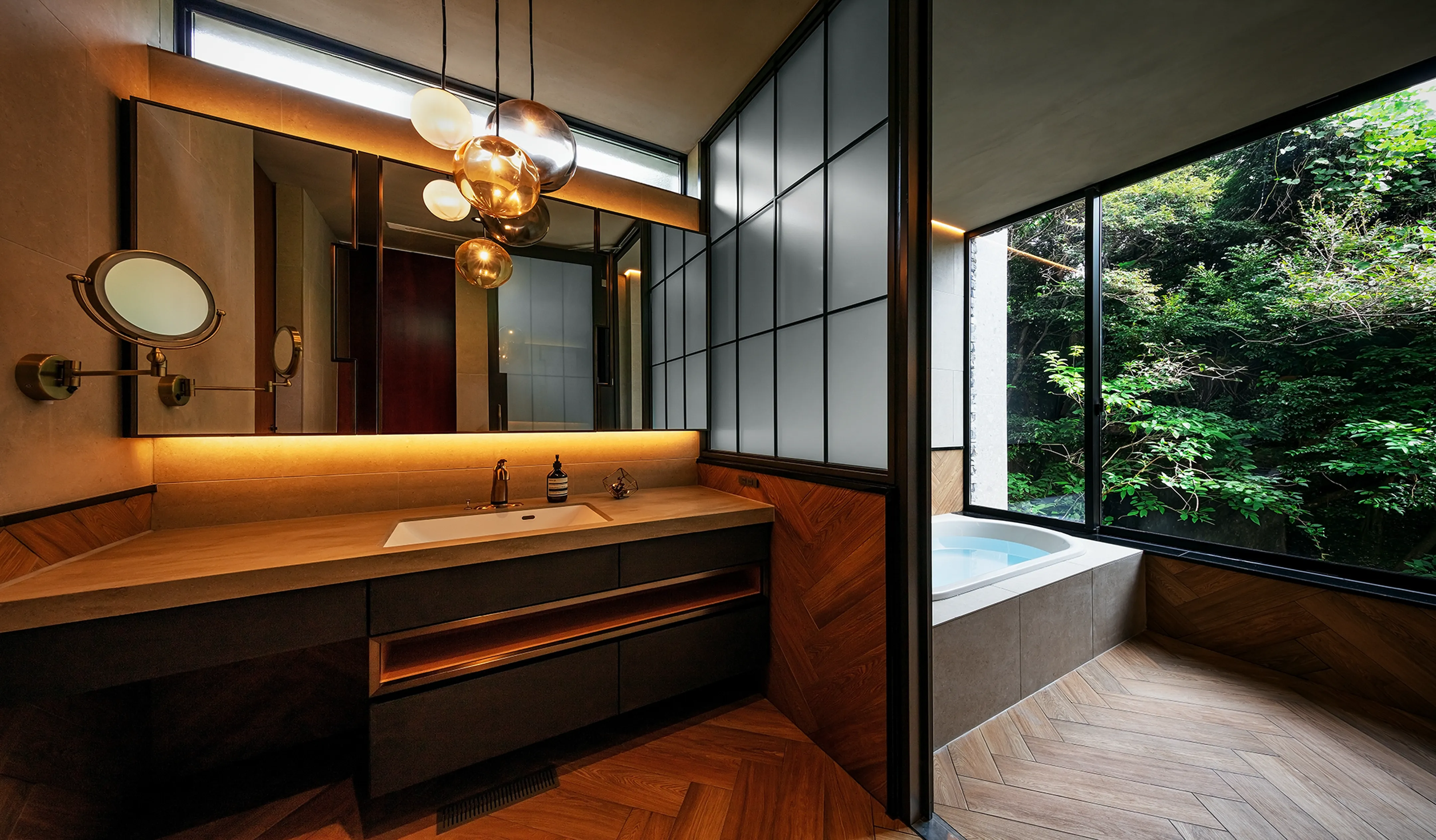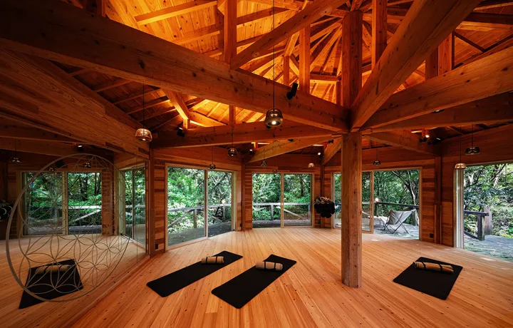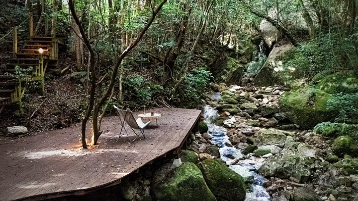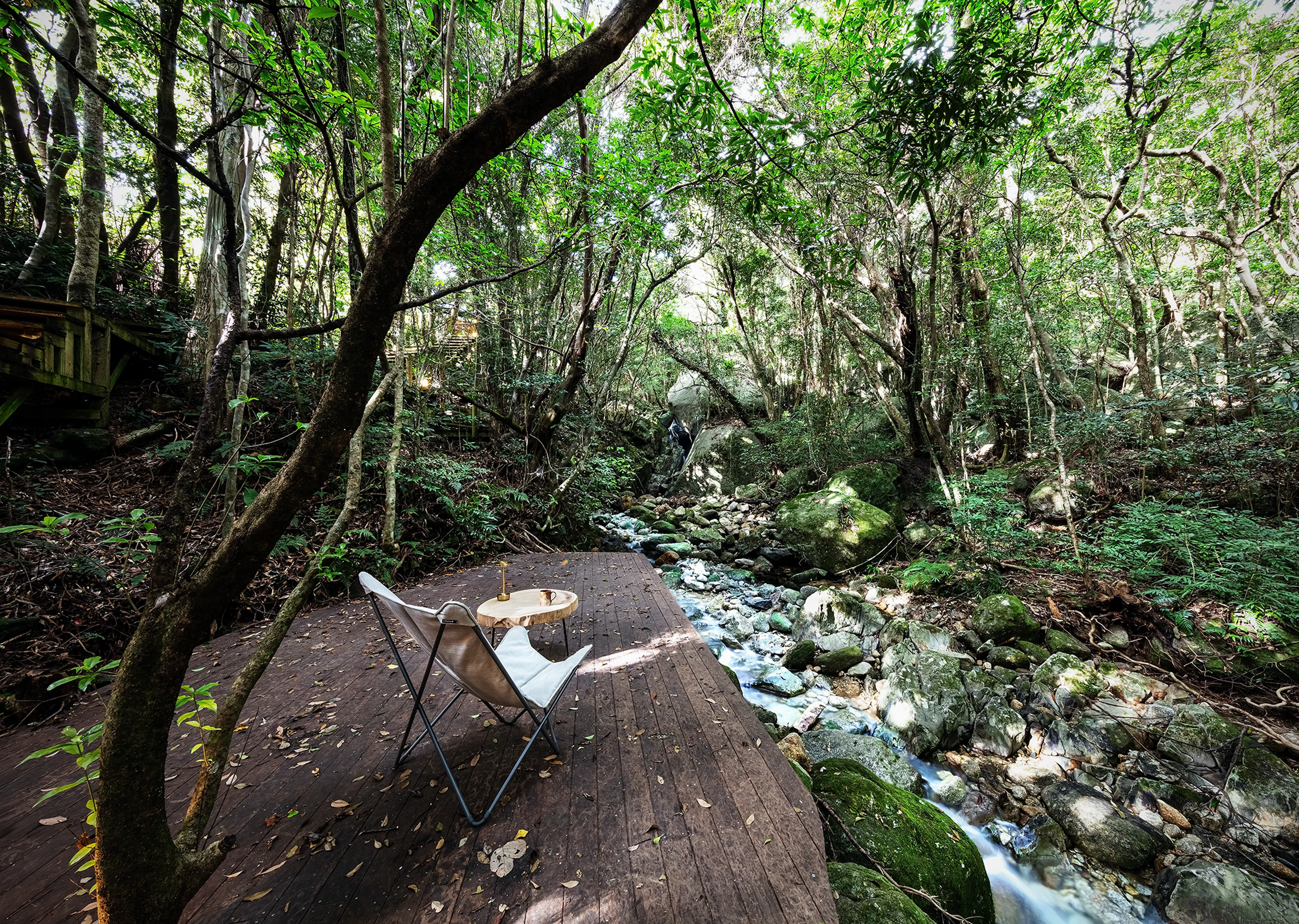 〈静寂で厳かな場〉への入り口となるメディテーションスペースは、ヨガや瞑想を通じて、まさに自らを自然のなかへと拓いていくための空間です。そこからさらに森へと潜るように小径を辿れば、沢のほとりに架けられたデッキに至ります。濃く重なっていく木々、濡れた岩肌、うつくしく落ちる木漏れ日、落水の音。訪れた人はここで、最も深く屋久島のなかに身を置き、自身の境界を曖昧にすることができます。