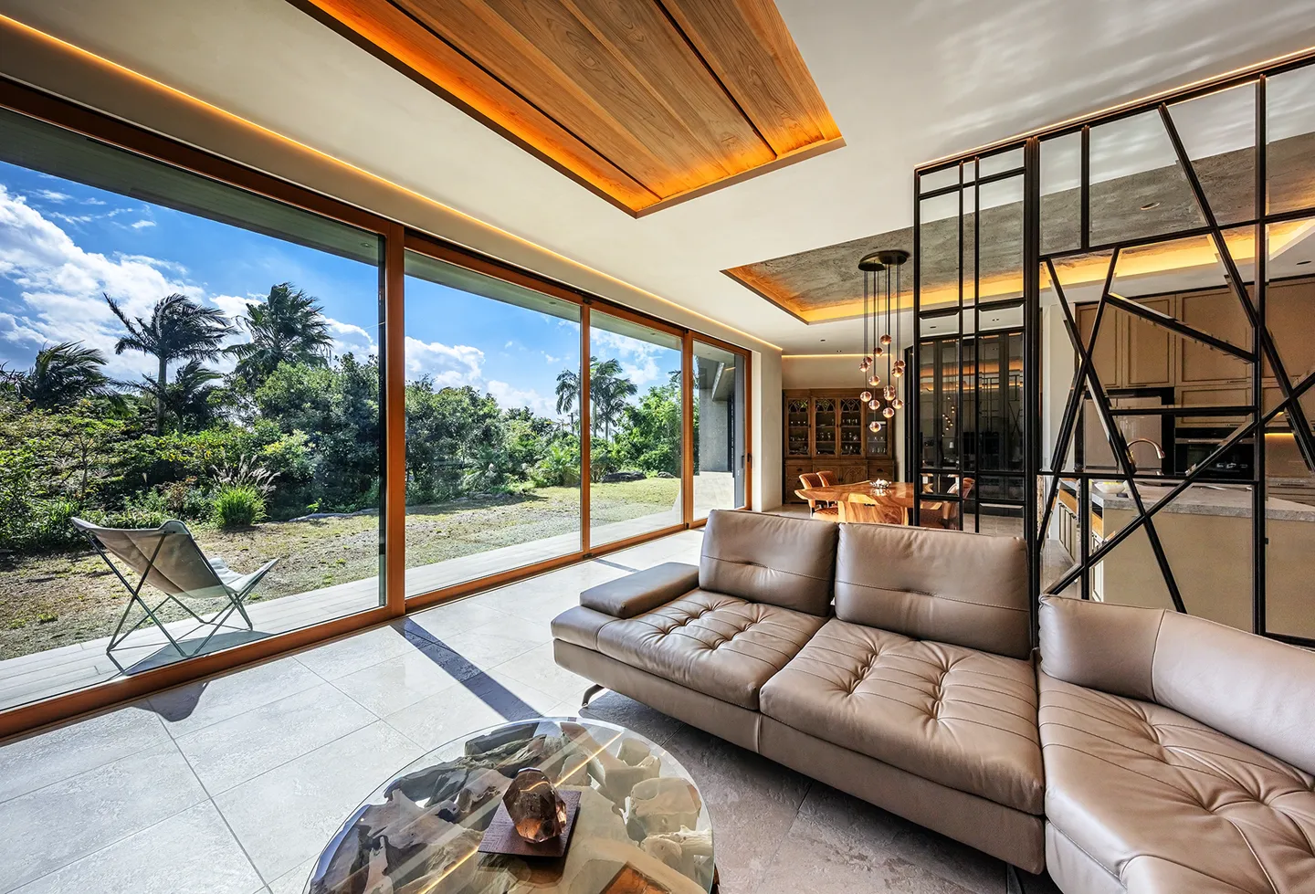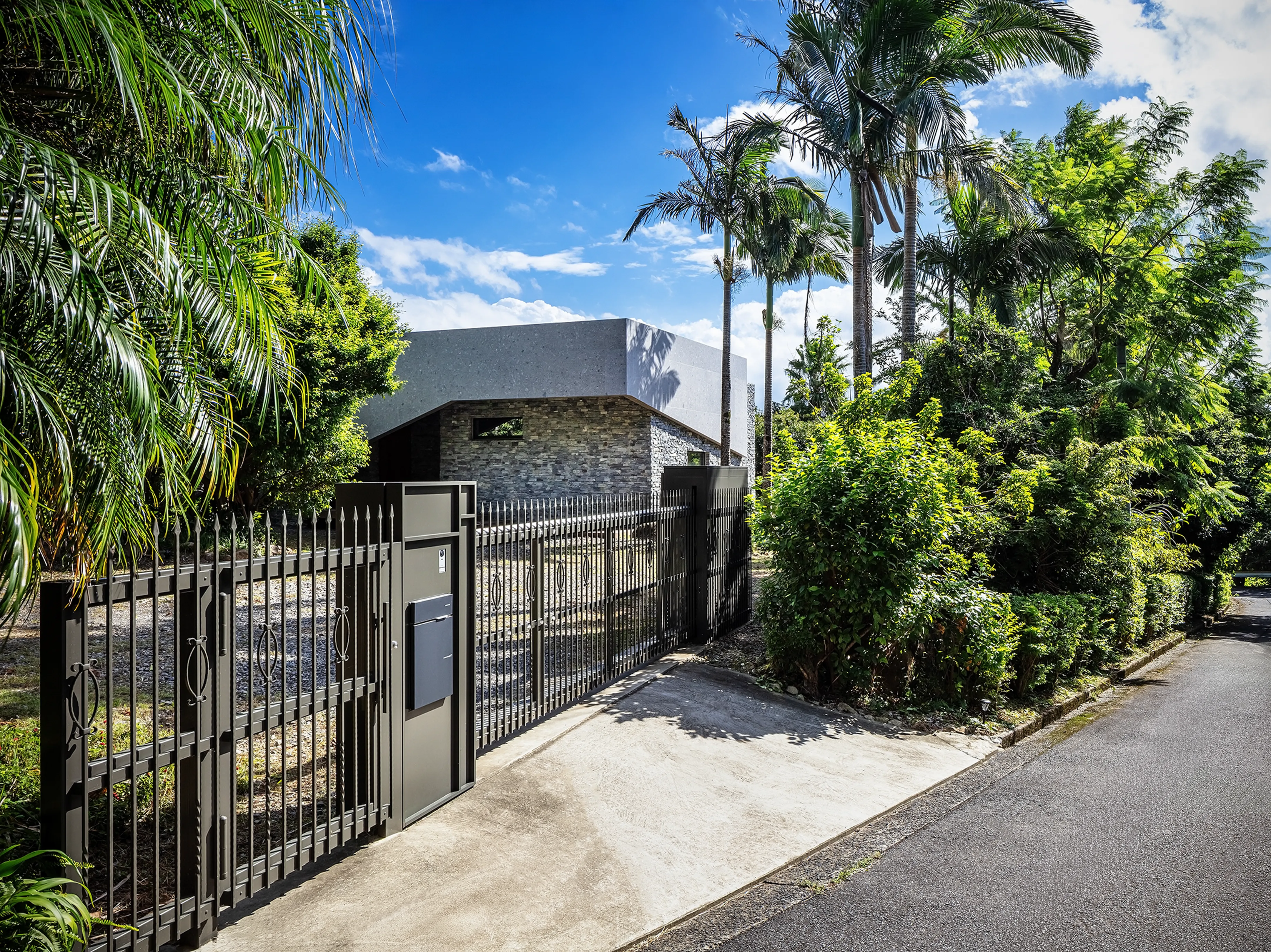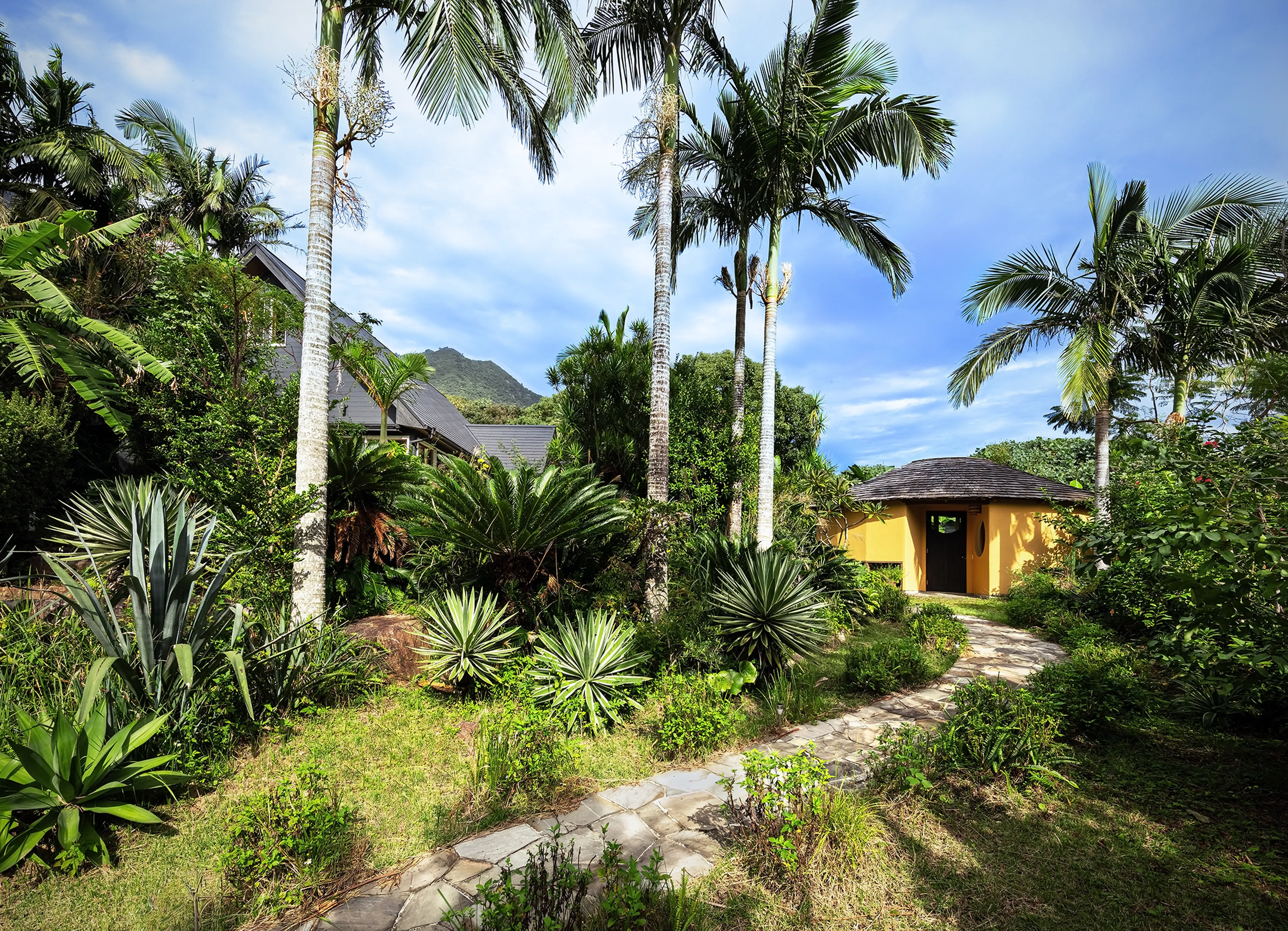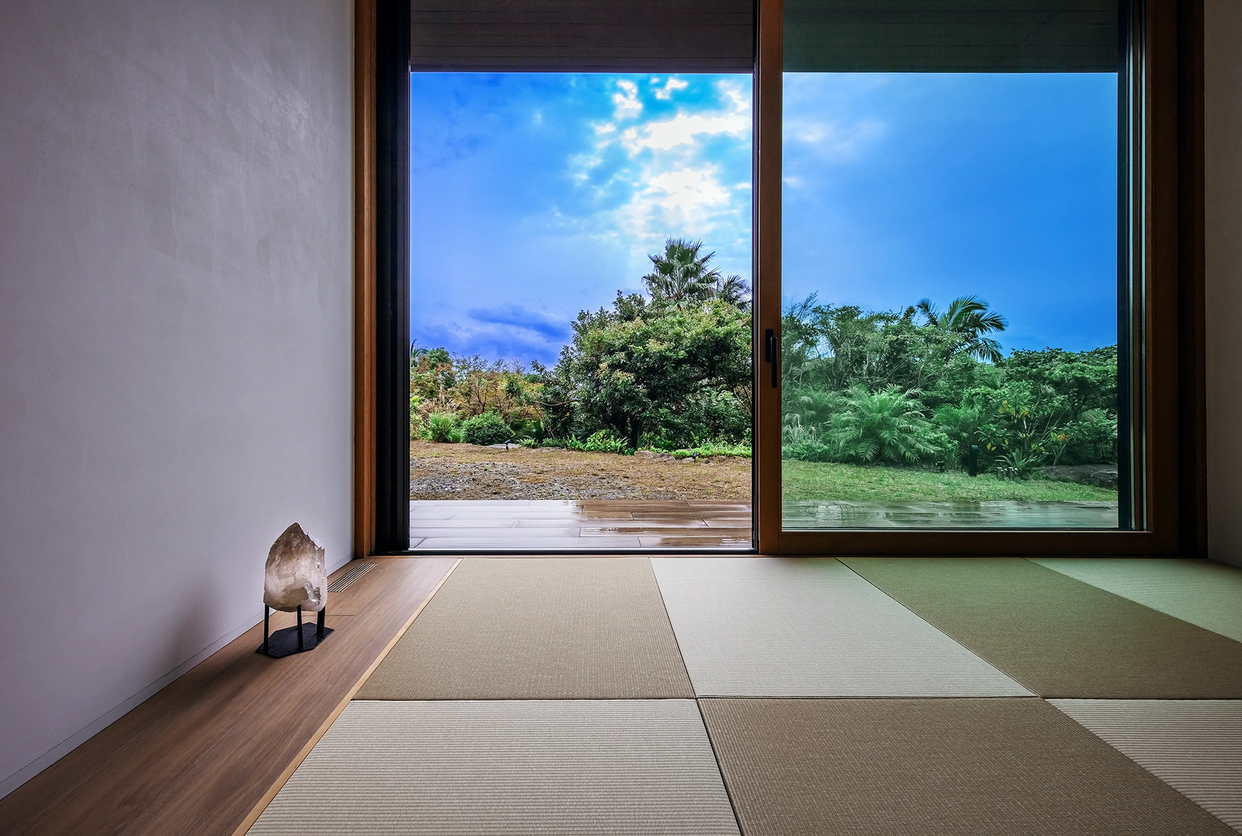 敷地は、島の山々から続く深く濃密な森のほとりにあります。周囲には屋久島らしい大岩が点在し、風へ揺れる葉ずれの音に鳥や虫の声、そこへ雨の音、沢のせせらぎ、落水の響きが折り重なるように聞こえてくる場所です。